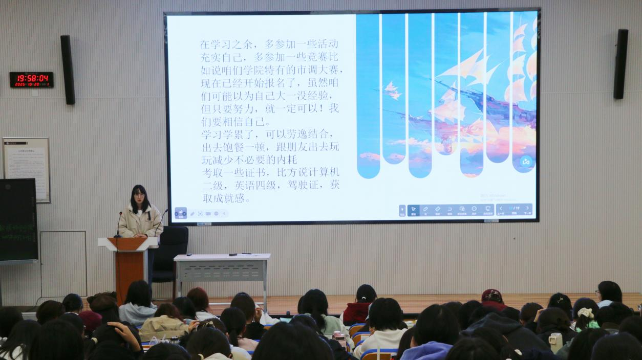 分享会上,优秀学生代表围绕课程学习、竞赛综测、心态目标三大核心,开启经验分享。她们将“学习与竞赛”比作游戏关卡,建议新生通过参与学科活动、竞赛积累“经验值”,助力实现奖学金、保研等“进阶目标”。会议最后,主讲人强调新生需保持主动求知热情、秉持松弛心态以避内耗,并建议制定分层短长期目标,用系统规划推动成长。