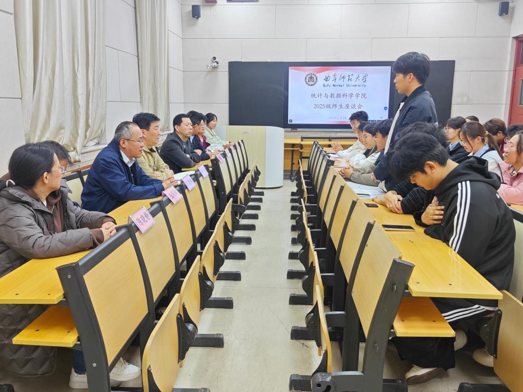 (通讯员:王英杰)为助力新生更好适应并融入大学生活,11月4日,统计与数据科学学院于文史楼211教室举办2025级师生座谈会。院长赵胜利、党委副书记季中、副院长赵翔华、团委书记李宴美、统计系主任陈晓林、数据科学系主任王明秋、教师代表陈晓静、2022级优秀学生代表及2025级新生代表参加座谈会,会议由学院团委书记李宴美主持。